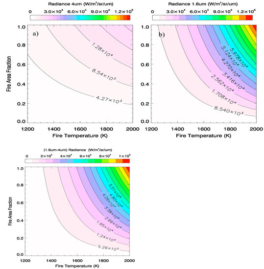 (a) Simulation of 4 µm (top left) and (b) 1.6 µm (top right) radiances for varying fire temperature and fire area fraction, as well as (bottom left) (c) their corresponding difference (1.6–4 µm) for varying fire temperature and fire area fraction. The background brightness temperature is considered uniformly at 300 K.