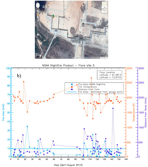 (a) A test site in Khanty-Mansiysk, Russia (Image courtesy: Google maps); (b) Fire area, temperature, and distance of detected pixel from the flare location for this site over five months in 2013, as retrieved by NOAA VNF version 1.0. The red lines represent the fire temperature reported by VNF for hot pixels found in proximity to the flare, whereas the blue and navy blue lines represent the fire area and distance from the flare to the center of the detected pixel, respectively.