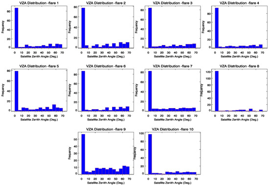 Histogram for view zenith angles for the same period and sites reported by VNF. It is noticeable that most flare detections are happening for viewing angles very close to nadir.