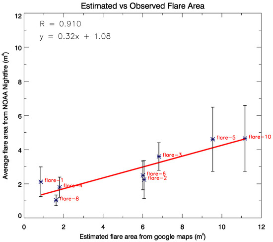 We also verified the fire areas reported by the VNF product for flares under study with the Google imagery. Triangular areas were drawn around the flare stacks over zoomed in Google Images to show foreknown flare locations and to approximately calculate the areas around the flares. It should be noted these are conservative estimates of fire areas for flares and are not representative of exact flame areas, as the flame size depends on various factors like wind speed and fuel burned. Therefore, deducing flare areas from flames is not very reliable. Verification of these areas could not be done for two locations of the flares because of the limitation of the available zoomed in Google imagery there. Figure 11 shows a scatter plot of the comparison between the mean of the areas reported by VNF and the area estimated by Google imagery. In order to remove the bias from the outliers for mean area calculations from the VNF product, the interquartile range (q0.25–q0.75) of all reported areas was used. The mean and the standard deviation were calculated using the data in this range only. The scatter plot shows a correlation of 0.91 between the imagery estimated and VNF areas, however, VNF is found to underestimate the areas of the flares.