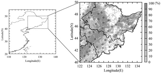 This study focused on northeastern China, mainly covering the provinces of Heilongjiang, Jilin, and Liaoning (Figure 1). The study area occupies a total of 1.228 million km2, accounting for 12.8% of the total area of China. The study area is characterized by a central plain, namely the Northeast China Plain (NECP) and surrounding mountains. The central plain is mostly covered by cropland. The crop system involves one harvest per year, and the dominant crops are wheat, corn, soybean, and rice. The climate of the study area is dominated by the East Asian Monsoon. The summer is hot and wet, and the winter is cold and dry. The mean temperatures in 1960–2009 in January (July) ranged from approximately −20 °C (21 °C) in the north to −10 °C (25 °C) in the south. The annual precipitation decreased from approximately 800 mm in the east to 400 mm in the west; over two-thirds of the annual rainfall occurs during the summer (June–August).