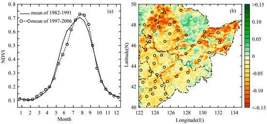Mean half-monthly Normalized Difference Vegetation Index (NDVI) for 1982–1991 and 1997–2006 within the study area (a) and the spatial pattern of NDVI changes (1997–2006 minus 1982–1991) for June (b).