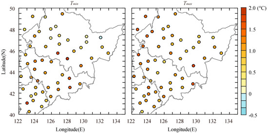 Along with the surface browning, there was significant climate warming in June across northeastern China from the 1980s to the 1990s. Both the daytime and the nighttime warmed greatly. Tmin increased by 0.67 °C, and Tmax increased by 0.61 °C across the 53 observation sites. As shown in Figure 3, Tmax increased strongly in the western part of the study area and weakly in the northeastern part of the study area, whereas Tmin increased weakly in the north and increased strongly in the central to southern parts of the study area. The pattern of Tmin increase, i.e., nighttime warming, revokes our idea that the strength of climate warming weakens with decreases in latitude from high- to mid-latitudes. This unexpected finding may suggest a contribution by local forcing on the spatial variability of local climate change. By comparing these changes with changes in NDVI, shown in Figure 2, we found that a strong increase in Tmin likely co-occurred with a weak decrease in NDVI, whereas a weak increase in Tmin likely co-occurred with a strong decrease in NDVI.