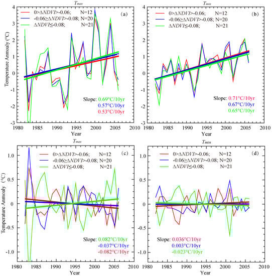 To exhibit the co-occurrence of changes in temperature and NDVI, we compared the temperature changes for groups of observation sites by ΔNDVI amplitude (Figure 4). The 53 sites were classified into three groups as follows: ΔNDVI > −0.06 (weak browning), −0.06 ≥ ΔNDVI > −0.08 (medium browning), and ΔNDVI ≤ −0.08 (strong browning). Figure 4a,b show that greater Tmax increases and smaller Tmin increases occurred at the sites with greater surface browning. Both Tmax and Tmin increased at rate of 0.53 °C/10 year and 0.71 °C/10 year, respectively, in the weak browning group, whereas Tmax and Tmin increased at rate of 0.69 °C/10 year and 0.65 °C/10 year, respectively, in the strong browning group. Such characteristics were exhibited much more clearly when the regional mean temperature changes were removed. As shown in Figure 4c,d, Tmax decreased and Tmin increased in the weak browning group, whereas Tmax increased and Tmin decreased in the strong browning group. These results suggest that, along with increased surface browning, daytime warming may be intensified while nighttime warming may be slowed. The vegetation degradation would potentially exert a warming effect on daytime and a cooling effect on nighttime.