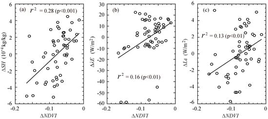 Following the strong correlation between the spatial variability of ΔNDVI and ΔλE, the spatial variability of atmospheric vapor changes were also correlated with that of vegetation growth changes. As shown in Figure 6, there was a strong positive correlation between the spatial variability of ΔNDVI and ΔSH, and the correlation coefficient was as high as 0.53 (p < 0.001). This positive correlation suggests that vegetation growth (degradation) co-occurred with much more (less) atmospheric water vapor. The changes in vegetation growth may explain ~28% of the spatial variability of ΔSH.