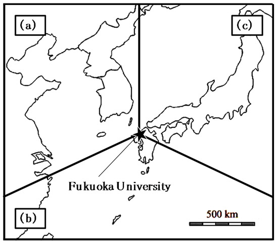 Map of East Asia showing each sector classified by airmass backward trajectories from the monitoring site (Fukuoka University, Japan): (a) Asian continent, (b) southern part of Kyushu, and (c) main islands of Japan.