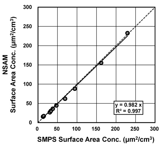 Other practical and continuous techniques are required to measure the concentrations of ambient aerosol surface area. A nanoparticle surface area monitor (NSAM) using the diffusion charging method has been developed for continuous measurement for the concentration of particle surface area [19,20,21,22,23]. Particles introduced in the NSAM first become charged with positive ions emitted by a corona discharger in a mixing chamber. Particle charge is measured by an electrometer installed downstream from the chamber. Surface area is calculated assuming that it is ideally proportional to the particle charge [19]. The actual NSAM output is the lung-deposited surface area (LDSA, the product of particle surface area and lung deposition efficiency) concentration of particles that can be converted to the concentration of ambient aerosol surface area [18,23,24,25,26,27,28].