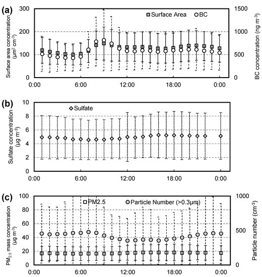 Table 1 shows the mean values of the concentrations of aerosol surface area, PM2.5 mass, BC, sulfate, and particle number measured in this study. The mean concentrations of surface area and other variables measured in this study were not so different from those presented in several previous papers [18,23,24,25,30].