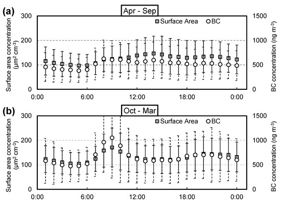 Diurnal variation in the aerosol surface area and BC concentrations in Fukuoka, Japan, measured from (a) April to September 2015, and (b) October 2015 to March 2016.