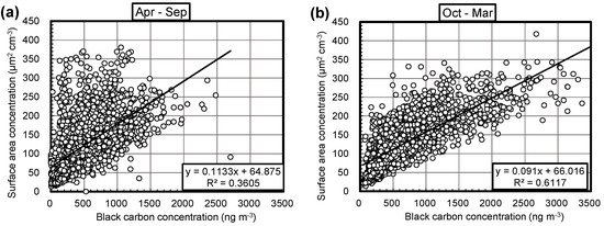 Correlation plots of the aerosol surface area vs. BC concentrations in Fukuoka, Japan, measured from (a) April to September 2015, and (b) October 2015 to March 2016.