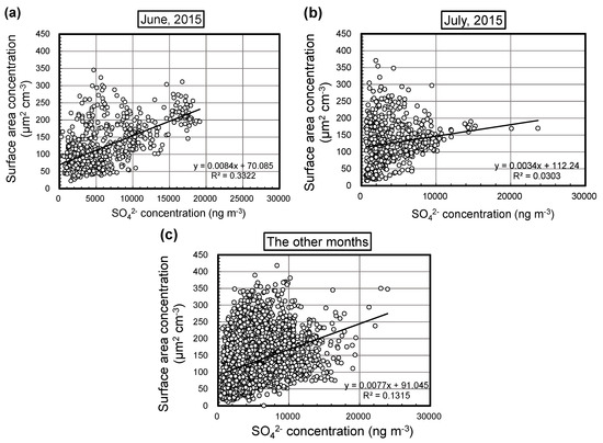 The correlation between the aerosol surface area and BC concentrations was analyzed on a monthly basis to investigate this relationship in more detail. Table 2 shows the slopes and intercepts of regression lines, the coefficients of determination, and the number of data in the correlation between aerosol surface area and BC or sulfate concentrations for each month through the year. The correlation between the aerosol surface area and BC concentrations were relatively strong (R2 = 0.41−0.76) for all months except June and July, for which the coefficient of determination was low (R2 = 0.23). This may have been the result of increasing sulfate concentrations [23], due to the fact that the correlation between the correlation between the aerosol surface area and sulfate concentrations was higher in June (R2 = 0.33) than in other months (R2 = 0.030−0.23; Table 2). The correlations between the aerosol surface area and sulfate concentrations were shown in Figure 6, and that in June (Figure 6a) actually shows that the high concentrations of sulfate increased aerosol surface area concentrations. These events did not appear in other months. For June, the number of data points for which the hourly sulfate concentration was ≥15 μg·m−3 and the aerosol surface area concentration was ≥150 μm2·cm−3 was extremely large (Figure 7). That is, high sulfate concentrations increased aerosol surface area concentrations, which resulted in a weakening of the correlation between the aerosol surface area and BC concentrations. According to a previous study, high-sulfate-high-surface area events were possibly caused by volcanic SO2 [23]. However, in this study, SO2 concentrations did not increase in June at Fukuoka, thus the high sulfate concentrations were likely not due to volcanic emissions. Furthermore, the coefficient of determination in the correlation between the aerosol surface area and sulfate concentrations was not high in July (R2 = 0.030; Figure 6b); on the contrary, it was the lowest of the year (Table 2). We therefore surmise that other chemical compounds, such as organic carbon, may have contributed to the July aerosol surface area concentration in Fukuoka.