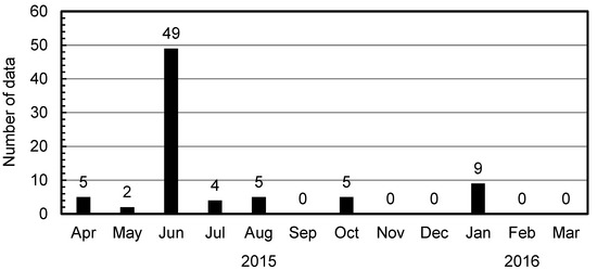 The monthly number of data points for which the sulfate concentration was ≥15 μg·m−3 and the surface area concentration was ≥150 μm2·cm−3 in Fukuoka.