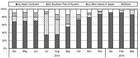 Airmass backward trajectories were calculated for each day of the measurement campaign using the NOAA HYSPLIT model [40,41]. The trajectories were calculated based on the following conditions: start latitude and longitude: 33.55° N, 130.36° E; start altitude: 1500 m above sea level; and calculation time: 72 h (three days). The trajectories were calculated every 3 h (0:00 to 21:00 of local time) and were allocated to one of three sectors ((a) Asian continent, (b) southern Kyushu, and (c) main islands of Japan, see Figure 1) if the trajectory positions for every 6-h interval were within the sector at least 36 h (50% of the time) and if the trajectory positions were within other sectors less than 24 h (33% of the time).