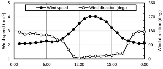 Diurnal variation in wind speed and wind direction in Fukuoka, measured from April 2015 to March 2016. Wind directions are as follows: 0°: Northerly, 90°; Easterly, 180°; Southerly; and 270°: Westerly.