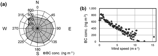 BC concentrations corresponding to (a) the wind direction, and (b) the wind speed, in Fukuoka, measured from April 2015 to March 2016.