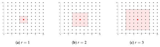 Local domains for different radii of influence r. The red dot is the model component to be assimilated, the red square denotes components within the scope of r, and components outside the region are unused during the local assimilation process.