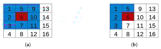 Another efficient EnKF implementation which makes use of covariance matrix localization is the EnKF based on a modified Cholesky decomposition (EnKF-MC) []. In this context, given a radius of influence r, uncorrelated errors are assumed between the component i and the model components , for , where stands for the predecessors of component i whose spatial distances do not exceed r. For a component i, the predecessors depend on some ordering of grid components, for instance, Figure 2 shows an example for a two dimensional domain when , , and grid components are labelled by using column-major format. In the EnKF-MC, the resulting estimator can be obtained in terms of Cholesky factors by using the Bickel and Levina estimator,