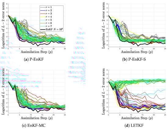 In Figure 3, the results are shown in terms of error norms and assimilation steps (p) for the compared methods, we group the results by radius sizes. As can be seen, there are parameter values for r and in which the results proposed by the filters are comparable with those obtained by the EnKF with a large ensemble size of . This supports the theory that, all filters can provide good approximations of posterior states with just a few ensemble members. However, the performance of the LETKF degrades as the radius size is increased, this can be explained as follows: in the LETKF, local background error correlations are estimated based on a local ensemble covariance matrix, therefore, sampling noise can easily impact the sample covariance matrix when the ensemble size is not much larger than the number of components within the local boxes. Such cases are not evident in the EnKF implementations based on a modified Cholesky decomposition. All these filters perform remarkably well and in all cases, the initial error (uncertainty) is decreased. The importance of having filters which are not so sensible to the parameters r and is that, in practice, such parameters can be hard to tune. Thus, one can prefer filter formulations whose accuracy is not highly impacted by changes in those parameters.