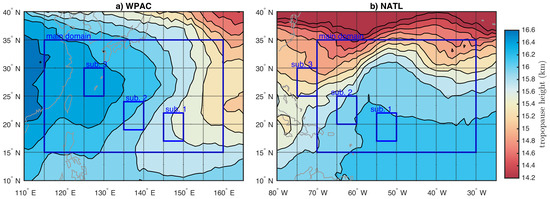 In the second set of experiments, three sensitivity experiments for each ocean basin were carried out with the same moisture structure as in the CTL experiments but with different temperature vertical profiles, which are obtained from the averaged sounding in three subdomains. This set of subdomain experiments with a fixed RH profile is to illustrate how the variations of the tropopause height in each basin can modulate the TC intensity and development. The spatial variation of the tropopause height across the ocean basin allows a natural design of these sensitivity experiments. Specifically, one notices from Figure 1 that the tropopause level in the NATL basin decreases along the southeast–northwest direction, which is roughly along the TC main trajectories in this area. In contrast, the tropopause level increases along the main direction of TC motion (i.e., the southeast–northwest direction) in the WPAC basin.