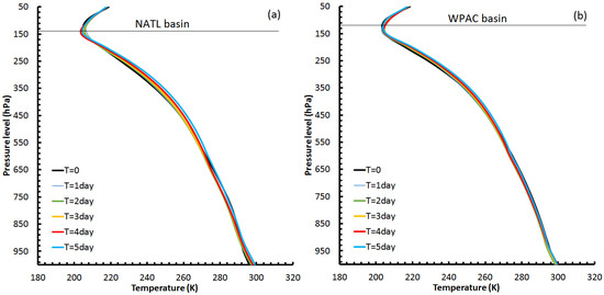 The evolution of the area-averaged temperature profiles (solid lines) within a radius of 500 km from the model storm center that are obtained from the Hurricane Weather Research and Forecasting (HWRF) model with the August mean sounding in (a) the NATL basin, and (b) WPAC basin valid at (black), day (blue), days (green), days (orange), days (red), and 5 days (cyan). Thin lines denote the corresponding tropopause level in each experiments.