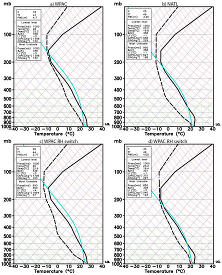 Mean August 2013 sounding profiles for (a) the WPAC basin, and (b) the NATL basin at initial model time that are averaged over a domain given in Table 1 (see Figure 1 for visualization of the spatial domain); (c,d) same as (a,b) but with the relative humidity (RH) profiles of the input soundings switched.