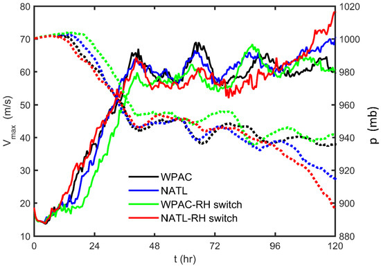 That the NATL temperature sounding results in stronger storms regardless of the moisture profiles indicates the overall more important role of the temperature structure in determining the maximum intensity limit. On the other hand, the similar role of the moisture profiles in changing the storm intensity between the CTL experiments and the RH-switching experiments in both the WPAC and the NATL basins suggests that the theoretical MPI limit may not fully explain the model-simulated maximum intensity limit. Specifically, the less mid-tropospheric moisture profile tends to delay the intensification as seen from both the RH-switched experiments in Figure 4. One can readily verify the relative role of the temperature and moisture profile to TC intensity within the MPI framework by using the theoretical MPI calculation based on the expression in [31] for four different soundings. While the theoretical MPI limits tend to overestimate the actual maximum intensity obtained from the HWRF model as shown in Table 3, it is apparent that the NATL’s temperature profile is more conducive to TC development than that in the WPAC, similar to the HWRF simulations (cf. Figure 4).