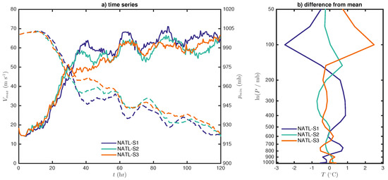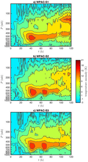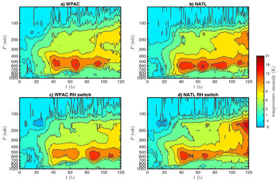 Given the importance of the DWC structure in the development of intense TCs as discussed in [11], it is anticipated that the lower tropopause height in the NATL basin could be a factor determining its higher storm intensity through the enhanced DWC development. To examine how the DWC development is related to the more favorable tropopause condition with the NATL sounding, Figure 5 shows the Hovmöller diagram of the temperature anomaly at the storm center in the CTL experiments during the course of the 5-day integration. Here, the temperature anomaly is defined as the temperature difference between the vortex center and the far-field ambient environment similar to the definition used in [11]. The far-field ambient temperature in this study is defined as the area-averaged temperature within an annulus of 1000–2000 km radii.