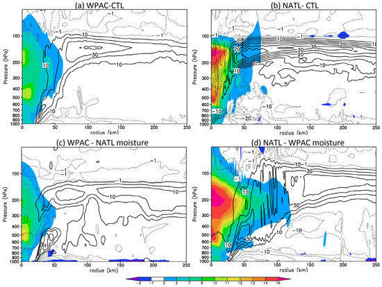 Radius-height cross-sections through the center of the storm of the temperature anomaly (K, shaded) for (a) WPAC-CTL, (b) NATL-CTL, (c) WPAC-RH switched, and (d) NATL-RH switched experiments valid at h. Solid (dotted) line contours are positive (negative) values of radial (in-plane) wind with a contour interval of 5 m s−1, with contours also included.