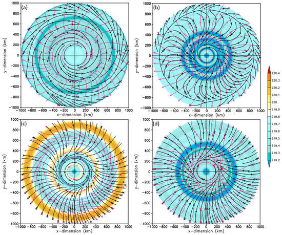 To verify the existence of such an upper-level inflow in the CTL experiments, Figure 7 shows streamlines averaged in the lower stratosphere layer (i.e., 100–70 hPa), along with streamlines representing the outflow within 150–100 hPa layer valid at h. As seen in Figure 3, the 100–70 hPa layer is well within the lower stratosphere layer and can therefore represent well the upper-level inflow above the outflow level in both of the NATL and WPAC basins. One notices in Figure 3 a clear signal of a cold outer-core annulus from 200 km to 800 km (blue shaded area) along with the existence of the inflow in the LSL very similar to the results in [11]. The NATL experiment with the WPAC moisture profile (Figure 7d) most clearly exhibits the upper-level inflow in the lower stratosphere, showing streamlines in the LSL strongly converging toward the vortex center. Our analyses of the temperature budget show that such an upper-level inflow is responsible for a warm advection towards the storm center, thus related to the formation of the HWC as discussed in [11] (not shown).