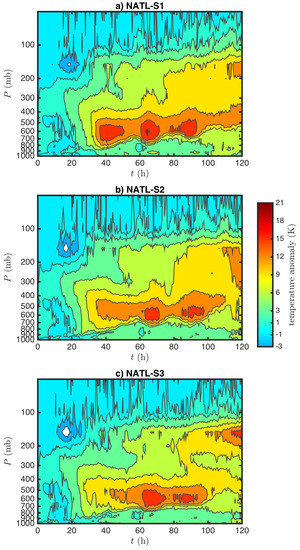 Analyses of the warm core structure in all NATL subdomain experiments reveal that these experiments in fact possess a similar warm core structure after 5 days into integration instead of very contrasting warm core features as in the WPAC subdomain experiments (see Figure 9, Figure 10 and Figure 11). Corresponding to the insignificant difference in the storm intensity is clear evidence of an HWC in all NATL subdomain experiments (Figure 11) , although the magnitudes of these HWCs are not exactly equal. Careful examination of the temperature anomaly at days shows that NS3 has in fact a more prominent HWC as expected from its lowest tropopause height, which exhibits an upper warm core anomaly as large as 15 K at days, as compared to only 11 K in the NS1 experiment (Figure 11a,c). However, the NS3 storm eventually approaches a weaker intensity consistent with its weaker lower-level warm core. The dominance of the HWC relative to the mid-level warm core in the NS3 experiment is somewhat difficult to understand, and may be related to the unfavorable tropospheric stratification associated with the lower tropopause that offsets the benefits of the enhanced LSL interaction aloft. While our current model diagnostics is insufficient to confirm this heuristic speculation, the development of a strong HWC with the relatively lower tropopause height in the NS3 experiment could at least indicate that the interaction between TCs and the lower stratosphere is sensitive to the height of the tropopause.