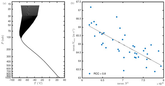 In order to implement different stratifications of the lower stratosphere layer into simulations with the RE’s model, the square of the Brunt–Väisälä frequency is used as a control parameter to characterize the stratospheric stratification. A range of input soundings was created with the same cold-point tropopause temperature and SST, but with the lower stratospheric varying around that of Jordan’s sounding from s−2 to s−2. The requirement of the same tropopause temperature and the same SST is important to ensure that the entire tropospheric structure is the same, thus keeping the analytical MPI limit fixed in all experiments. As such, any difference in the storm intensity among -varying experiments will reveal the impact of the LSL rather than those associated with SST, the outflow temperature, or the tropospheric stratification. Given the default Jordan sounding and a prescribed increment of s−2 for , 35 input soundings were generated by adding an increment of temperature values at all model levels above the tropopause such that the value of above the tropopause is changed by an increment of s−2 in each experiment (see Figure 12a).