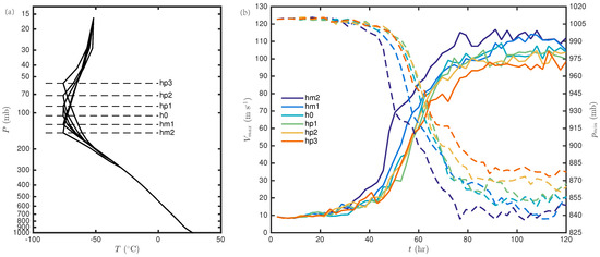 It is important to note that while the formation of an mid-level warm core is natural and persists in the 500–400 hPa layer throughout all stages of the TC development, the formation of an HWC is intermittent during the early phase of the storm development in all experiments. Similar to [11], the HWC in all four CTL experiments becomes most apparent only after the vortex intensity reaches 61 m s−1 with a well-defined eye. Additionally, the emergence of the HWC is separate from the mid-level warm core, and its formation precedes a second phase of intensification from h to h (cf. Figure 4) in all experiments. Such independent development of the HWC and the lower warm core around 5–6 km is not specific to the HWRF model or any experiments, but can be seen also in recent analyses of temperature anomalies by [14,15], suggesting that the HWC development is strongly associated with the late intensification of an already intense storm.