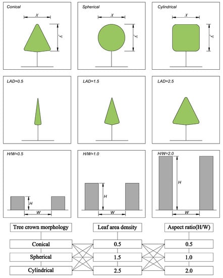 To investigate the effects of different aspect ratios on air flow and particulate dispersion, the building height (H) was set to 10, 20, and 40 m to correspond to H/W = 0.5 (shallow street canyons), H/W = 1.0 (symmetric street canyons), and H/W = 2.0 (deep street canyons), respectively [46]. Typical avenue trees, namely, Fraxinus pennsylvanica × F. velutina, Sophora japonica and Populus tomentosa, with conical, spherical, and cylindrical crown morphologies, respectively, were selected given their high application frequency in the central districts of Beijing. Their respective frequency values were 11.97%, 34.51%, and 12.68% [47]. A previous study reported that the common LADs of avenue trees range from 0.5 to 2.5 m2/m3 [48]. Thus, LADs of 0.5, 1.5, and 2.5 m2/m3 were selected in the simulation. We combined 27 cases with different tree crown morphologies, aspect ratios, and LADs (Figure 4).