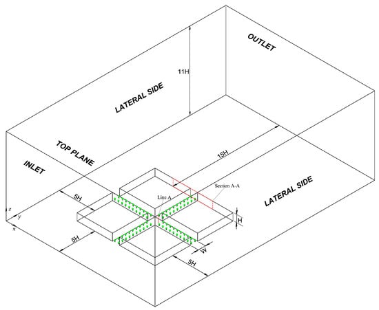 The CFD simulation computational domain was composed of two street canyons in the X-direction and one streamline canyon in the Y-direction (Figure 5). The street width, building width, and building length were 20, 100, and 100 m, respectively. The trees were modeled with the same green volumes of 10,000 m3 and planted at both sides of street canyons with a distance of 2 m from the buildings, and the CBH was set as 1 m (Table 3). In accordance with recommendations [37,49,50], the distance of the computational domain inlet to the target area was set to 5 H, and the outlet boundary was set to 15 H. A symmetry condition was imposed at the left and right lateral sides with a distance of 5 H, and the height from the ground to the top plane was set to 11 H. Section A-A was set at y = 380 m, and vertical line A was located at x = 320 m and y = 310 m.