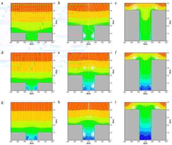 Figure 7 depicts the air velocity and streamline fields with conical canopy at y = 380 m which is shown as section A-A in Figure 5. Adding trees increases the reverse flow in the street canyon and the reduction in wind velocity. The distribution of wind fields becomes uniform as H/W increases. Air velocity increases slowly in the street canyon accompanied by high H/W. Upward flow starts from top to bottom in the tree-free scenario where H/W = 0.5. When H/W = 1.0, two parallel vortices appear in the street canyon (the left vortex is counterclockwise and the right is clockwise), and upward and downward airflows meet at approximately z = 15 m. For H/W = 2.0, two vortices (the left vortex is counterclockwise and the right is clockwise) appear at the top of the buildings in the street canyon. The analysis of cases where LAD = 0.5 indicates that upward flow, which starts from top-right to bottom-left, forms a small vortex in H/W = 0.5. Trees change the flow field, and the downward and upward flows meet at the top of the building (z = 20 m), thereby making the two-sided airflow move downwards and the middle airflow move upward. Thus, four horizontally aligned counter rotating vortices appear in the street canyon (Figure 7e). For H/W = 2.0, the airflow moves from bottom to top, and two aligned vortices appear near the building top. In cases where LADs = 1.5 and 2.5, the upward flow starts from top-right to bottom-left and forms no vortex for H/W = 0.5. Compared with LAD = 0.5, in H/W = 1.0, the aligned vortices become smaller (LAD = 1.5) or even disappear (LAD = 2.5).