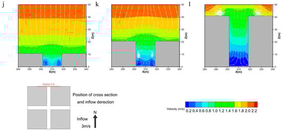 In cases where H/W = 1.0, the convergence in the windward street canyon is enhanced and the portal-type vortices of the leeward street canyon weaken with the increasing LAD. In cases where LAD = 0.5, reverse flow at the stream-wise street and the change of the flow direction within the left-up and right-down canyons conduct lower airflows along the street canyons. The flow field where LAD = 1.5 creates a uniform wind field, and trees ensure maximize momentum and reduce air velocity in the LAD = 2.5 case (Figure 6h,k).