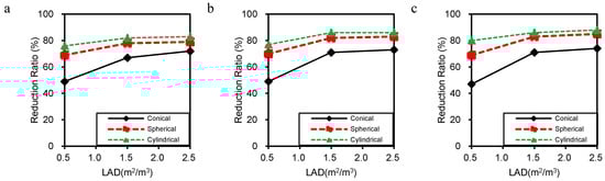 Reduction ratio at z = 1.5 m in average PM2.5 for conical (a), spherical (b), and cylindrical (c) canopies.