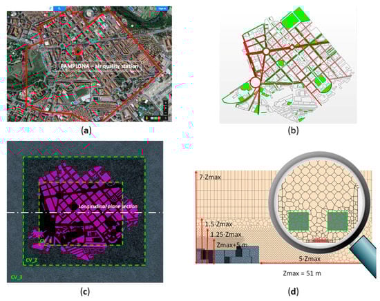 (a) II Ensanche neighbourhood of Pamplona (Google Maps® satellite image []), with indication of the modelled domain in red; (b) Computational Fluid Dynamic (CFD) 3D model of buildings, trees (green), and traffic emissions (red); (c) CFD mesh model; (d) Zoom at the longitudinal plane section of CFD mesh: typical sizes as function of the highest building in the domain, Zmax.
