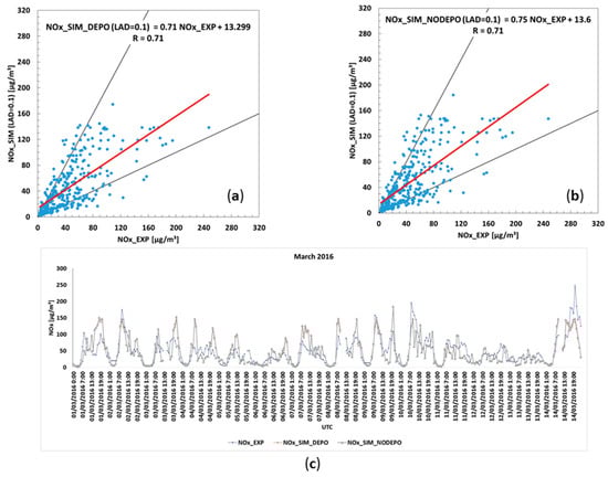 (a) Scatter plots of modelling results considering deposition; (b) Scatter plots of modelling results when deposition is neglected; (c) Time series of concentrations at the air quality (AQ) monitoring station position from 1st March to 14th March 2015. NOx_EXP and NOx_SIM are experimental and modelled NOx concentrations, respectively. NOX_SIM_DEPO and NOx_SIM_NODEPO are modelled NOx concentration with and without considering deposition.