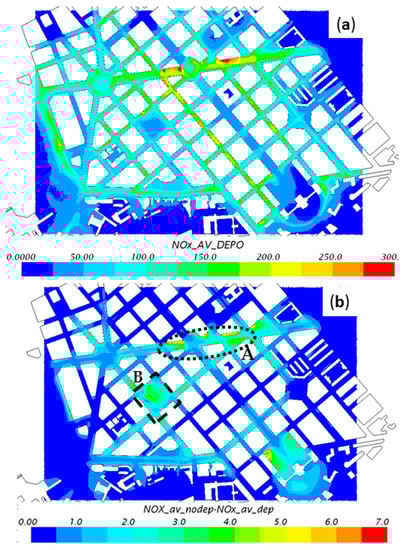 (a) Time-averaged NOx concentration taking into account pollutant deposition; (b) Differences of time-averaged NOx concentration due to considered deposition effect.
