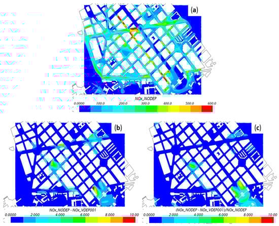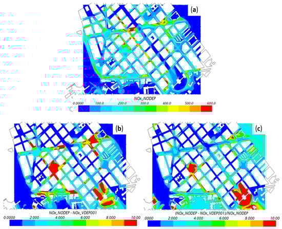 Current-1 scenarios: (a) NOx concentration map obtained by neglecting deposition; (b) Absolute differences of NOx concentration between considering and neglecting deposition for vdep = 0.01 m s−1; (c) Same as (b), but in terms of relative percentage differences.
