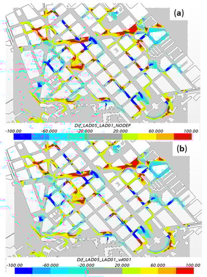 The increase of tree-foliage induces not only a greater deposition, but also a greater modification of street ventilation (higher aerodynamic effects). Comparing concentrations obtained for the Current-2 scenarios (LAD = 0.5 m2m−3) with those of the Current-1 scenarios (LAD = 0.1 m2m−3), it can be noted that the increase of LAD strongly affects the ventilation of the streets inducing different concentration patterns (see Figure 4 and Figure 5). Focusing on aerodynamic effects, differences between Current-2a and Current-1a scenarios are compared (Figure 6a). The figure shows that the concentration increases in some zones or decreases in others and a pedestrian street (street without traffic emissions, see emissions in Figure 1b) is not affected by the increase of LAD. In some other streets, the maximum and minimum of differences are close due to slight displacements of recirculation and stagnation zones. However, the zones where the concentration is higher for LAD = 0.5 m2m−3 are wider than the zones where it is reduced. This is also observed considering a deposition velocity 0.01 m s−1 (Figure 6b). For example, the area where the concentration increases of 20 µg m−3 or more is 1.81 greater than the area where it decreases of 20 µg m−3 or more (2.01 when no deposition is considered), and the average of differences is 5 µg m−3 (6.2 µg m−3 when no deposition is considered). Moreover, the spatial-averaged concentration increases as LAD increases and the effect of deposition is not enough to cancel out the reduction of ventilation in these cases. Figure 7 shows the spatial-averaged concentrations in the neighborhood for Current-1 and Current-2 scenarios. Here, only for vdep = 0.03 m s−1 (note that this value is very high and does not seem to be realistic for NOx) the deposition almost cancels out the effect of ventilation reduction in terms of spatial-averaged concentration. In all cases, the NOx concentration is clearly higher (1–8%) for Current-2 cases (LAD = 0.5 m2m−3) than for Current-1 (LAD = 0.1 m2m−3). Thus, it can be concluded that in these cases the aerodynamic effects of vegetation on air pollutant concentration are more important than the deposition.