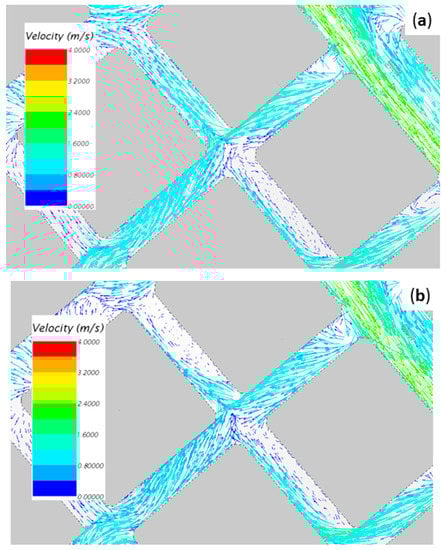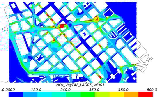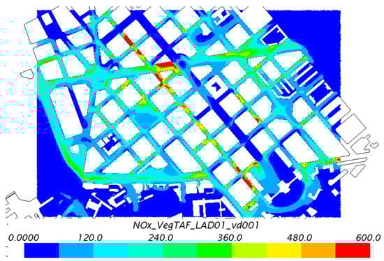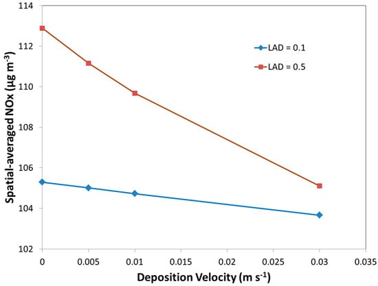 Second, the study focuses on the worst case in terms of air quality. The maximum values of NOx concentrations have been found at 8 a.m., which correspond to the maximum of traffic emissions in these streets during the day. Taking this into account, the focus is on NOx dispersion under these adverse conditions. Meteorological data obtained from a station located close to the neighborhood have been used to simulate the typical meteorological conditions at this hour. Under these adverse conditions, the impact of deposition and aerodynamic effects of trees on pollutant concentrations has been analyzed, as well as the effect of increasing LAD or planting new trees. To analyze a wide range of deposition velocities, four deposition values were considered: 0, 0.005, 0.01, and 0.03 m s−1. The objective is not to employ a specific and accurate value of deposition velocity, but to analyze the impact of vegetation on pollutant concentration for several scenarios with different realistic deposition velocities. This allows us to generalize the results for different deposition conditions as performed in Santiago et al. [] for idealized scenarios. Specifically, the analysis focuses on: