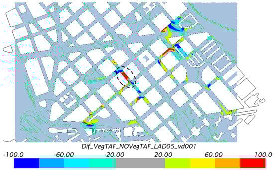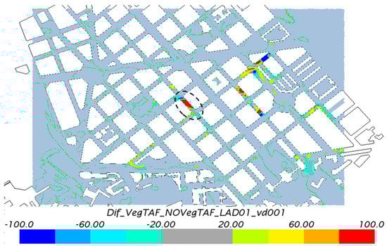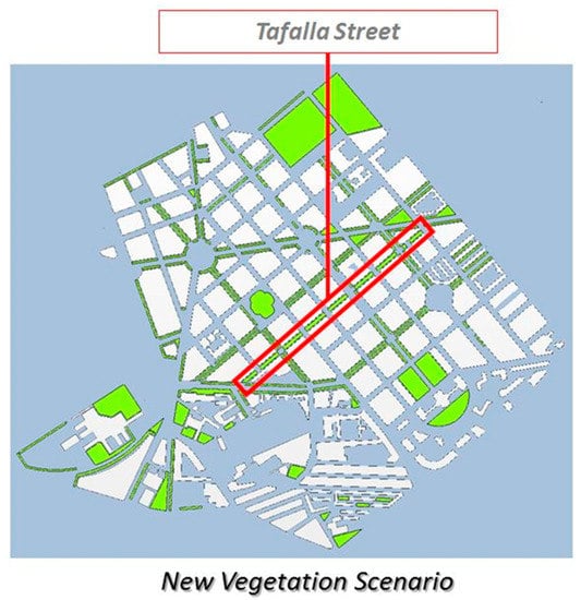 In the investigated neighborhood, there is, in particular, a tree-free street (Tafalla Street, see Figure 8) and virtual scenarios including trees with different foliage (New-1 with LAD = 0.1 m2m−3 and New-2 with LAD = 0.5 m2m−3) scenarios have been simulated and compared with Current-1 and Current-2 cases (see Table 1). These new trees have modelled with the same features as trees of the parallel street. By introducing such trees, the surface covered by vegetation increases from 13.8 to 14.8% of the domain.