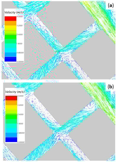 (a) Flow pattern in Current-2 case; (b) Flow pattern in New-2 case in the area limited by dashed line in Figure 13.