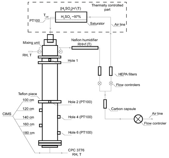 The experimental setup used in this study was described in detail in our previous work [23,24] and therefore only a brief description is given here. All experiments were conducted at Finnish Meteorological Institute in Helsinki, and thus all above mentioned major sources of atmospheric amines are in the vicinity of the laboratory. The whole experimental apparatus consists of four main parts: a saturator, a mixing unit, a flow tube and the sulfuric acid detection system—Chemical Ionization Mass Spectrometer (CIMS) [25], presented in Figure 1. The H2SO4 wall loss measurements were carried out in a laminar flow tube at three temperatures of 278.20 (±0.2), 288.79 (±0.2), and 298.2 (±0.2) K using purified, particle free and dry air as a carrier gas. The flow tube is a vertically mounted cylindrical tube made of stainless steel with an inner diameter (I.D.) of 6 cm and a total length of 200 cm. The whole flow tube was insulated and kept at a constant temperature with two liquid circulating baths (Lauda RK-20). The flow tube consists of two 1 meter long parts; one of them is equipped with 4 holes in the distance of 20 cm from each other, see Figure 1. Sulfuric acid vapour was produced by passing a stream of carrier gas through a saturator filled with 95–97% wt sulfuric acid (J.T. Baker analysed). As a saturator we used a horizontal iron cylinder with Teflon insert (I.D. 5 cm) and it was thermally controlled using a liquid circulating bath (LAUDA RC-6). The temperature inside the saturator was measured with a PT100 themperature sensor (±0.05 K). The carrier gas saturated with H2SO4 was then introduced with a flow rate from 0.1 to 1 L·min−1 into the mixing unit made of Teflon and turbulently mixed with a stream of humidified particle free air. The saturator temperature and the flow tube temperature were kept the same (isothermal conditions, see Figure 1), and the amount of sulfuric acid in the system was then governed by the amount of flow through the saturator and the subsequent mixing flow. The only part that was not temperature-controlled was the mixing unit. The mixing unit, which was −18 cm from the beginning of the flow tube (see Figure 1), was kept slightly warmer to avoid any condensation and particle formation in it. However, with the experiments taking relatively long (hours, one profile) the mixing unit cooled down a bit (at 278 and 288 K), and thus the temperature gradient was not prominent. The mixing unit had following dimensions: O.D. = 10 cm, I.D. = 7 cm and height = 6 cm. The flow rate of the mixing air varied in most of the experiments from about 7 to 10 L·min−1. The mixing air was humidified with one pair of Nafion humidifiers (Perma Pure MH-110-12) connected in parallel, where the flow of the mixing air was split into half for longer residence time and better humidification in both humidifiers. Ultrapure water (Millipore, TOC less than 10 ppb, resistivity 18.2 MΩ·cm @25 °C) circulating in both humidifiers was temperature controlled with liquid circulating bath (Lauda RC-6 CS). Both lines of the carrier gas (saturator and mixing air) were controlled by a mass flow controller to within ±3% (MKS type 250). The relative humidity was measured at the centre and far end of the flow tube with two humidity and temperature probes (Vaisala HMP37E and humidity data processor Vaisala HMI38) within accuracy of ±3%. The sulfuric acid diffusion coefficients were estimated as a function of relative humidity from the H2SO4 loss measured by CIMS along the flow tube. The detailed information regarding the operational principles and calibration of CIMS is given in [25,26,27] and therefore will not be given here again. The charging and detection efficiency of CIMS in the presence of trace concentrations of base impurities is discussed thoroughly theoretically (e.g., [13,28]) and also in recent experimental reports (e.g., [9,10]). Possible attachment of base and/or water molecules to single H2SO4 molecules (at levels of impurities of this work) is not expected to have a notable effect on their detection efficiency. However, both free H2SO4 molecules and those bound to base and/or water molecules are detected as single H2SO4 molecules by CIMS, since the ligands are quickly lost upon the chemical ionization (e.g., [28]). In this study the actual H2SO4 concentrations are not of particular interest, we focus here only on relative loss of H2SO4 along the flow tube. The concentration of sulfuric acid in gas phase was measured as 97 m/z Da using CIMS along the flow tube (see Figure 1) at the beginning (0 cm), in the middle (100 cm) and at the lower part in distances of 120, 140, 160, and 180 cm from the beginning and at the outlet (200 cm) of the flow tube in a wide range of relative humidities from 4 to 70%. The concentrations of H2SO4 are reported here as measured values. The CIMS sampling flow rate was set to 7 L·min−1. In order to measure the H2SO4 concentration along the whole flow tube, an additional CIMS inlet sampling tube was used—a stainless steel tube with I.D. 10 mm and whole length of 122 cm (100 cm straight + 22 cm elbow-pipe). Considering the H2SO4 losses, the sampling tube behaves in the same way as the flow tube, that is, for constant steady conditions the relative losses are constant (independent of H2SO4 concentration). The detailed separate experiments on H2SO4 losses within the sampling tube are discussed in detail by Brus et al. (2011) [29]. The inlet of the CIMS was about the mid-height of the flow tube (110 cm from ground), the sampling tube thus covered whole necessary length for sampling from top to bottom of the flow tube. The CIMS’ rack was equipped with wheels allowing movement, and the CIMS was moved in horizontal direction of maximum distance of about 1 m from the flow tube when the sampling tube was connected to mid-height port of the flow tube. The experimental measurement proceeded in the following way: First, all the experimental conditions (te