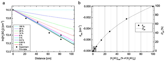 Figure 2. Results from computational fluid dynamics (CFD) FLUENT simulations on the influence of increased H2SO4 concentration on the flow tube wall. (a) ln[H2SO4] as function of distance in the flow tube. (b) kobs and diffusion coefficient difference from the infinite sink boundary condition (Ddiff) as a function of the H2SO4 concentration on the wall expressed as % of the initial H2SO4 concentration, [H2SO4]0. The simulations conditions were RH = 5%, T = 298 K and Qtot = 7.6 L·min−1. When the H2SO4 concentration on the wall is ≤ 6% of [H2SO4]0, the resulting difference in the obtained diffusion coefficient is within 10% when compared to diffusion coefficient obtained with infinite sink boundary condition on the wall, as indicated by the shaded box in bottom left corner in Figure 2b. The H2SO4 concentrations are low, ranging from 6.5 × 105 to 1.2 × 106 molecules· cm−3, and the points at each distance are averaged over 20-min with a standard deviation of less than 10% of the average value.