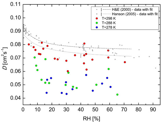 Figure 3. Experimental diffusion coefficient of H2SO4 in air as a function of relative humidity at different temperatures compared with the data of Hanson and Eisele (2000) [6] at 298 K and Hanson (2005) [20] at 295 K of H2SO4 diffusion in N2.
