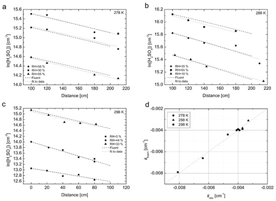 Figure 4. The sulfuric acid losses simulated with CFD FLUENT model when the experimentally obtained diffusion coefficients are used as an input at (a) T = 278 K; (b) T = 288 K and (c) T = 298 K. (d) simulated losses rate coefficients compared with experimental values of kobs (cm−1) at T = 278, 288 and 298 K. The instances of each symbol in panel (d) represent loss rate coefficient at different relative humidities, the lowest relative humidity having the steepest slope (the highest absolute value of loss rate coefficient).