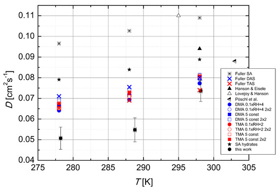 where DAB is the binary diffusion coefficient of species A and B (cm2·s−1), T is the temperature (K), P is the pressure (bar), MAB is 2((1/MA) + (1/MB))−1 (g·mol−1), where MA and MB are the molecular weights of species A and B (g·mol−1), and ∑v is calculated for each component by summing its atomic diffusion volumes [17]. The functional form of Equation (4) is based on the kinetic gas theory (the Chapman-Enskog theory), and the temperature dependence is obtained from a fit to a large set of experimental diffusion coefficients. A purely theoretical approach based on the kinetic gas theory with the hard-spheres approximation would yield a dependence of T1.5. The calculated values of the diffusion coefficients of H2SO4, dimethylamine- and trimethylamine-sulfate in dry air at 298 K using the Fuller method are 0.11, 0.08 and 0.074 cm2·s−1, respectively, which is in a reasonable agreement with our experimental data—the measured diffusion coefficient of H2SO4 at T = 298 K under close to dry conditions (RH 4%) is 0.08 (cm2·s−1). However, when calculating the diffusion coefficients of H2SO4 in dry air at lower temperatures (278 and 288 K) with the Fuller method, the agreement of the experimental values with the predictions deteriorates. The formula predicts significantly higher diffusion coefficients than those observed in the experiments. The calculated values of DAB for H2SO4 are 0.104 cm2·s−1 at T = 288 K and 0.098 cm2·s−1 at T = 278 K, and the measured values are 0.07 cm2·s−1 at (T = 288 K and RH = 8%) and 0.054 cm2·s−1 at (T = 278 K and RH = 16%), respectively. The temperature dependence of the experimental diffusion coefficients was found to be a power of 5.6 for the whole dataset and temperature range, when averaged over the RH between 15–70%. Since the data show a clear stepwise temperature dependence we provide also two separate fits to data from 278 to 288 K and from 288 to 298 K, with power dependencies of 1.9 and 9.4, respectively. These numbers are striking when compared to the empirical method of Fuller et al. (1966) [15], who obtained the best fit to 340 experimental diffusion coefficients with the power dependence of T1.75. In Figure 5 we show the temperature dependence of the experimental data obtained from literature [6,18,19], predictions of the Fuller method [15] for the diffusion coefficients of sulfuric acid, dimethylamine- and trimethylamine-sulfates in dry air, results of the clustering kinetics simulations using quantum chemical data for several simulated systems (discussed below), and the experimental data of this work. The data collected from literature, all obtained using laminar flow technique and N2 as the carrier gas, show a temperature dependence opposite to the one expected from theory. However, the range of temperatures at which the measurements were carried out is quite narrow (only 8 K) and different experimental set-ups could explain such behaviour.